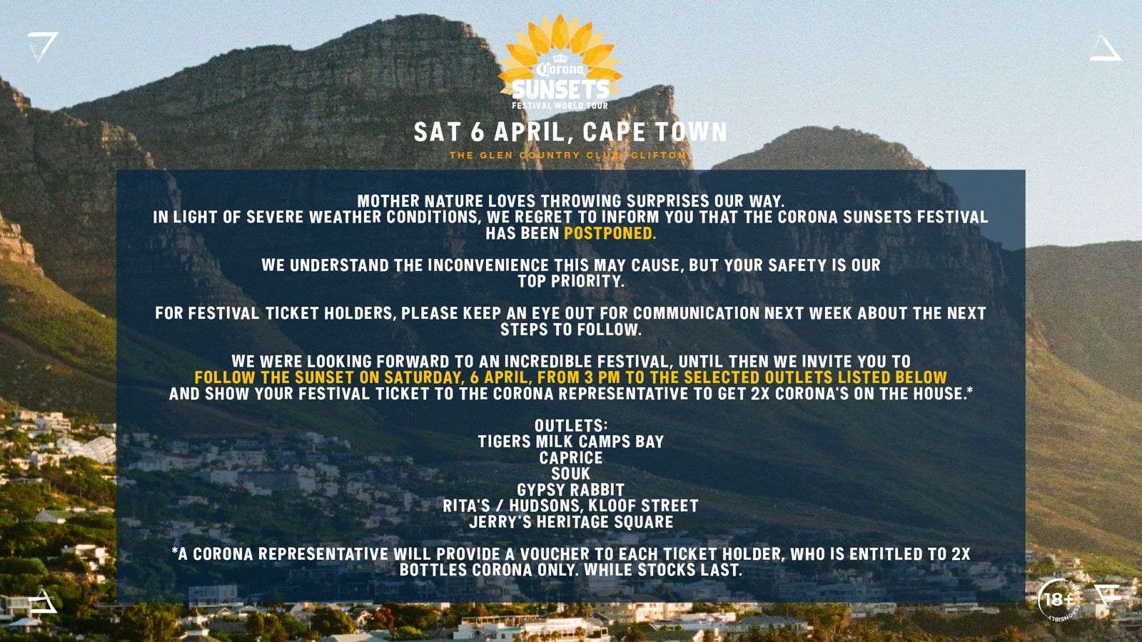 Following the success of the Corona Sunsets Festival World Tour which launched in Cape Town last year, festival goers were once again looking forward to another iconic sunset experience hosting the best in global music & lifestyle entertainment. But unfortunately the weather had other plans for us, as the festival was cancelled due to the Cape Town Storms.