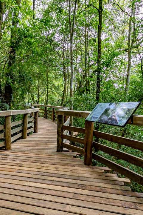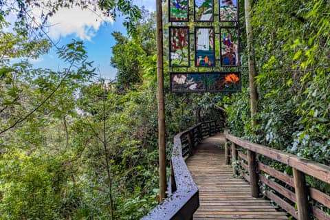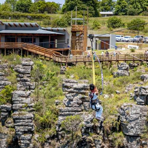 The glass windowed lift descends 50 meters into a beautiful gorge. A 600m walkway offers a rare opportunity to discover the beauty of this ecosystem with its unique birds, trees and a waterfall. Thoughtful and playful information signs explain the forests ecosystem. Waterfalls through the gorge are dramatic and tranquil all at once. The Suspension bridges meander along a 600-metre trail through the indigenous forest with interactive exhibits.